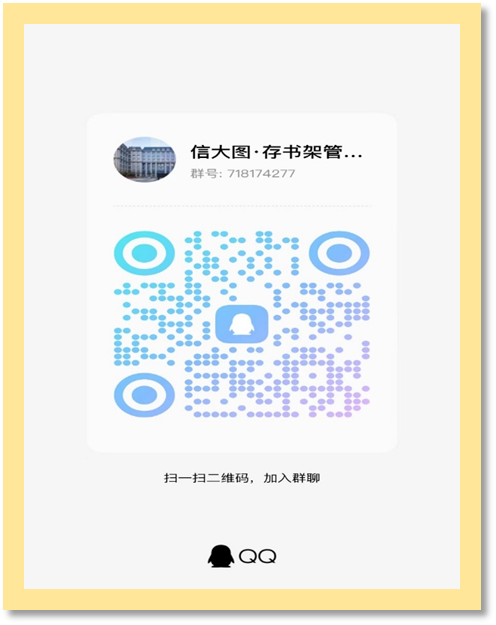 凡是预约申请到存书架的校本部同学,请加入“信大图·存书架管理群”,群号:718174277,QQ群实名制,进群请发送身份验证信息和修改群昵称“书架编号(大写英文字母及数字编号)+学生姓名+学院名称”,经审核通过方能进群。