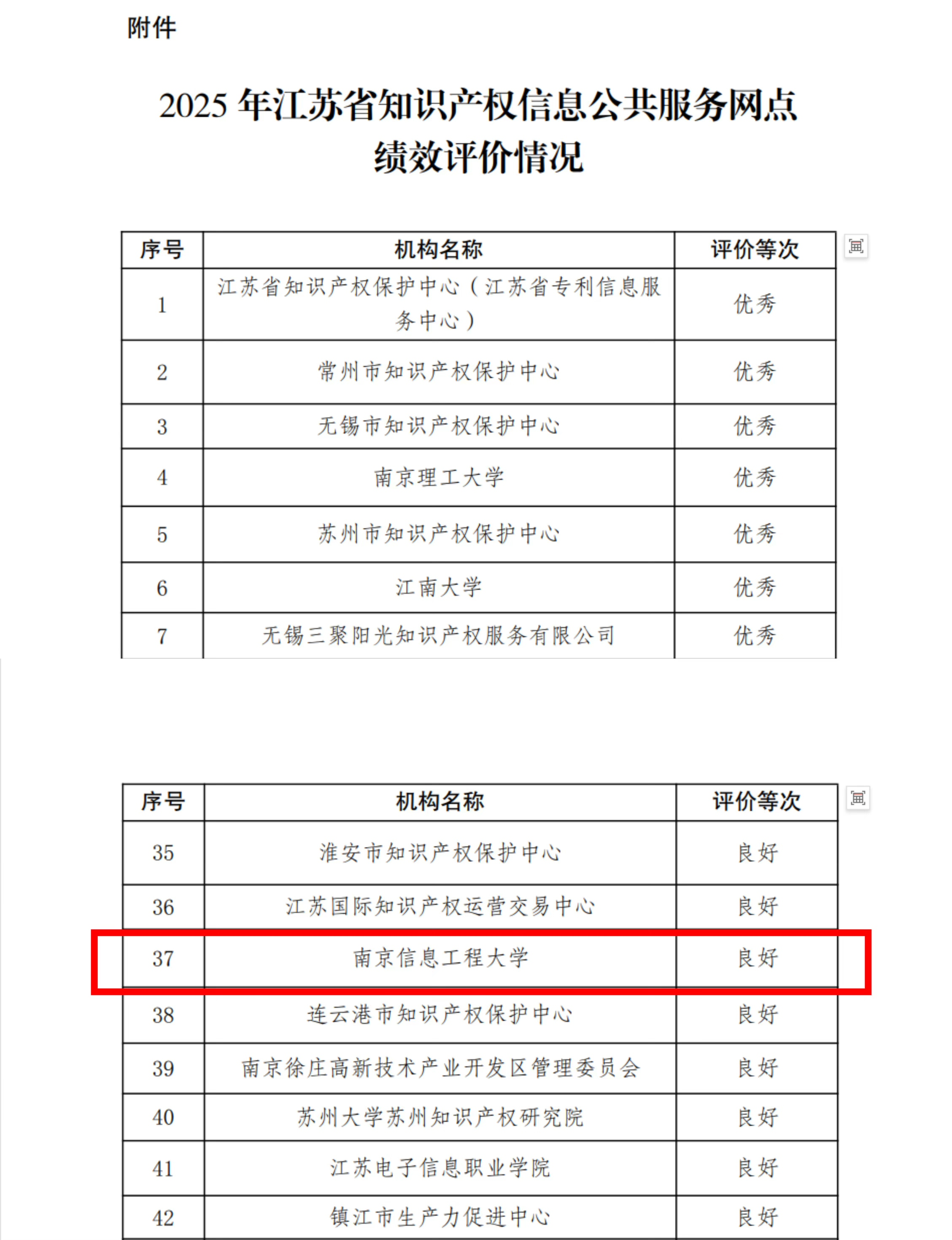 近日,江苏省知识产权局公布了2025年度全省知识产权信息公共服务网点绩效评价结果,我校知识产权信息服务中心(以下简称“中心”)获评“良好”等次。与此同时,“中心”成功通过国家知识产权局组织的2022年度国家知识产权信息公共服务网点续期考核。这一“省考”与“国检”的顺利通过,标志着“中心”自成立以来在服务体系构建、专业能力提升及特色化发展方面取得了阶段性扎实成效,服务能力获得权威认可。