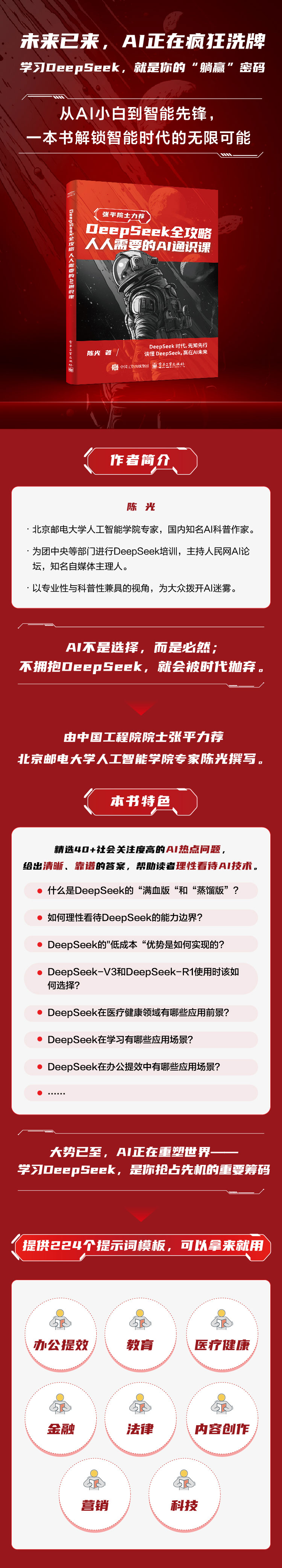 《DeepSeek全攻略:人人需要的AI通识课》全书以问答形式展开,将复杂的AI技术概念转化为通俗易懂的语言,从基础知识到应用实践,从理论讲解到案例分析,深入浅出地介绍了AI技术的核心原理和应用方法,为零基础读者搭建了全面的AI通识认知框架。