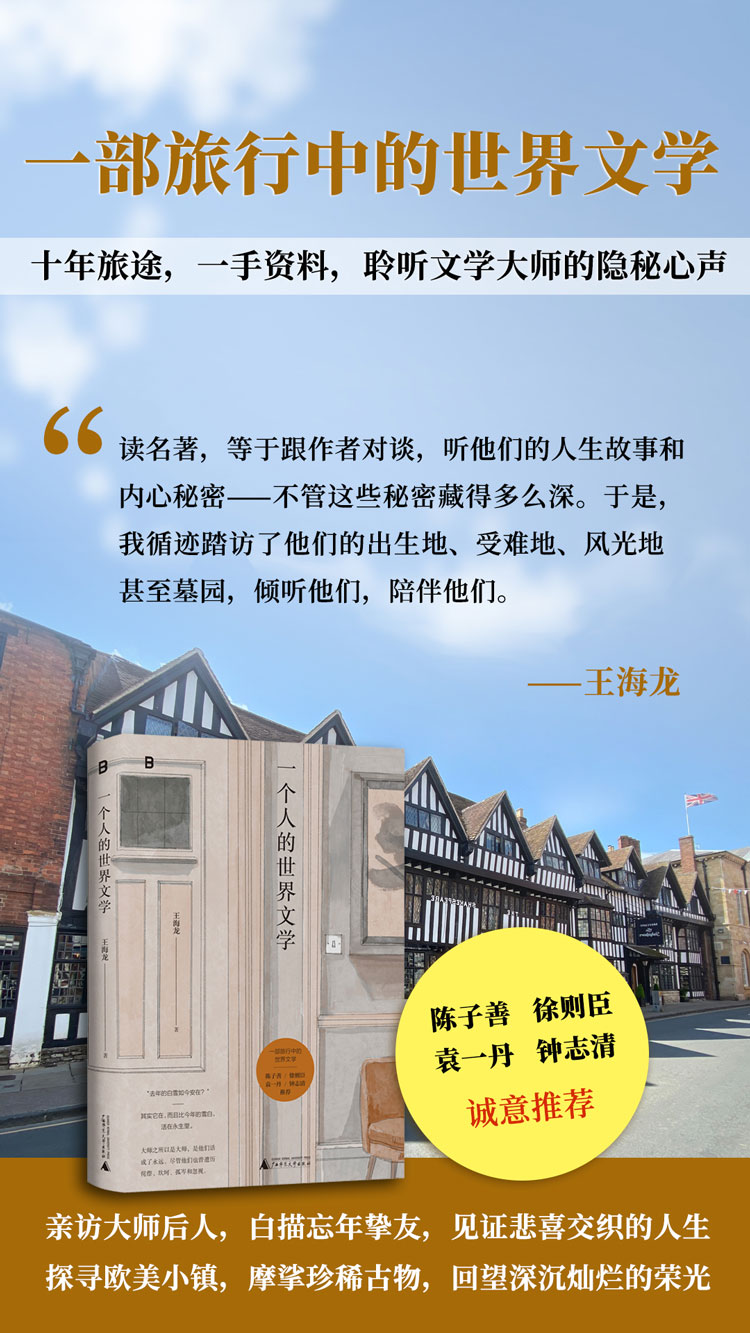 《一个人的世界文学》是旅美学者王海龙撰写的文化随笔集。全书以作者十年间游历欧美二十余座博物馆、文学地标及名人故居的经历为主线,融合文学探访、人类学视角与跨文化思考,通过实地考察但丁、莎士比亚、巴尔扎克等文学巨匠的创作场景,结合对徐志摩、郁达夫等华人作家后裔的口述采访,构建了一部“行走的文学史”。书中既还原了经典作品诞生的历史语境,也揭示了大师光环下的凡俗悲欢,旨在唤醒读者对文明遗产的敬畏,传递“文学滋养灵魂”的核心价值。
