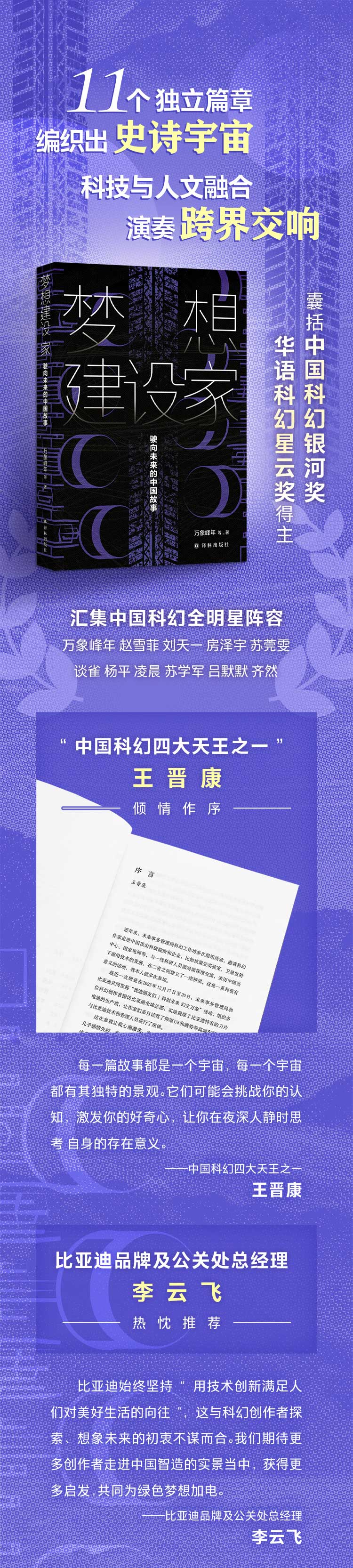 《梦想建设家:驶向未来的中国故事》是一部由中国顶尖科幻作家集体创作的科幻小说集。这部作品源于未来事务管理局(以科幻文化为核心的专业机构,由前新华社记者姬少亭于2016年创立)与比亚迪联合发起的“我迪朋友们|科创未来 幻生万象”活动,11位作家在参观比亚迪全球总部后,围绕新能源、人工智能、深空探索等科技主题展开创作,融合古代文明与音乐元素,构建了11个独立又相互呼应的未来图景。