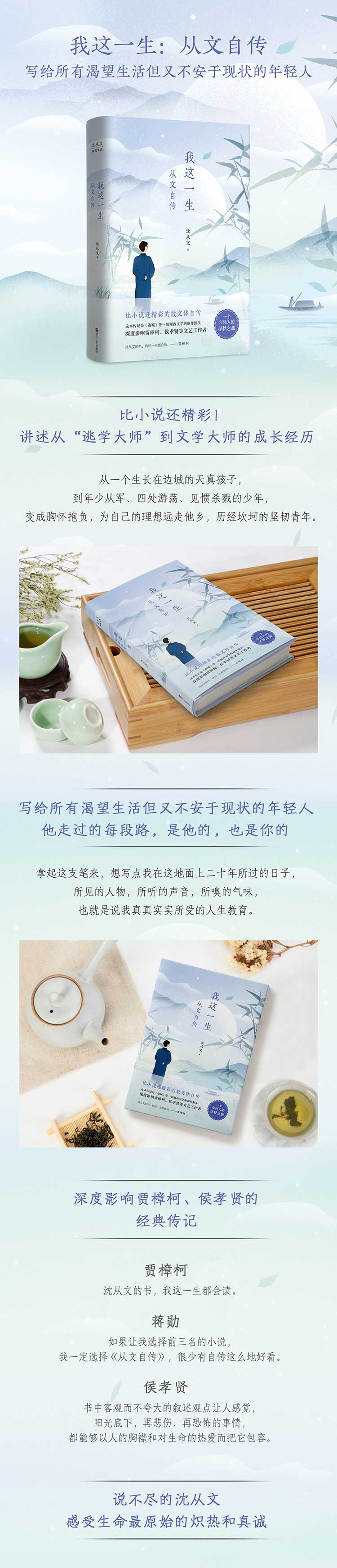 《我这一生:从文自传》是浙江人民出版社推出的沈从文自传体作品精编本,系统梳理了沈从文从湘西少年到文学大师的生命轨迹。书中前半部分以1932年完成的《从文自传》为核心,记录作者20岁前的成长经历;后半部分增补其中年至晚年的回忆性散文,形成跨越六十载的完整精神自画像。