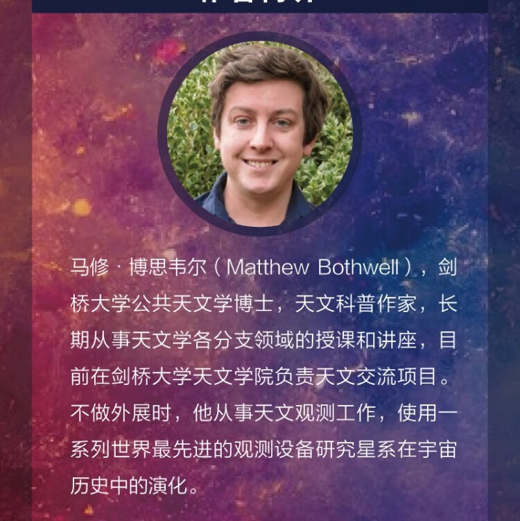 作者马修·博思韦尔博士是剑桥大学天文学院的公共天文学博士,长期负责天文传播项目,也参与实际的观测研究工作。他的主要研究方向是星系演化,尤其关注星系在宇宙历史中的形成与变化过程。除了本书,他还为《卫报》《新科学家》等媒体撰写科普文章,并在BBC纪录片中担任科学顾问。在学术界,他被认为是“少数能把复杂概念讲清楚”的天文学家之一;在读者群体中,他则被视为“不装、不玄、不贩卖焦虑”的靠谱作者。