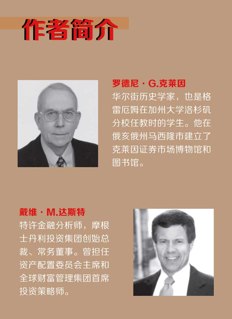 本书的两位编著者均具备深厚的专业背景与独特的学术优势。罗德尼・G. 克莱因是华尔街历史学家,也是格雷厄姆在加州大学洛杉矶分校任教时的学生,他对格雷厄姆的投资思想有着直接的理解与传承。1983 年,克莱因在俄亥俄州阿克伦市的一家古董店偶然发现了刊登格雷厄姆文章的早期《华尔街杂志》,随后开始系统搜集相关文献,最终促成了本书的编纂,其严谨的史料整理工作为本书的学术价值奠定了基础。戴维・M. 达斯特是特许金融分析师,同时担任摩根士丹利投资集团创始总裁、常务董事,拥有丰富的实战经验与深厚的理论功底,他为本书撰写的导读和总结,不仅梳理了文章的核心观点,更搭建了早期思想与现代投资实践的桥梁,让经典智慧能够被当代读者有效吸收。两位编著者一人侧重史料挖掘,一人侧重实践解读,共同让这本书既保持了历史的真实性,又具备了现实的指导意义,他们的合作也被投资界视为 “学术传承与实践应用结合的典范”。