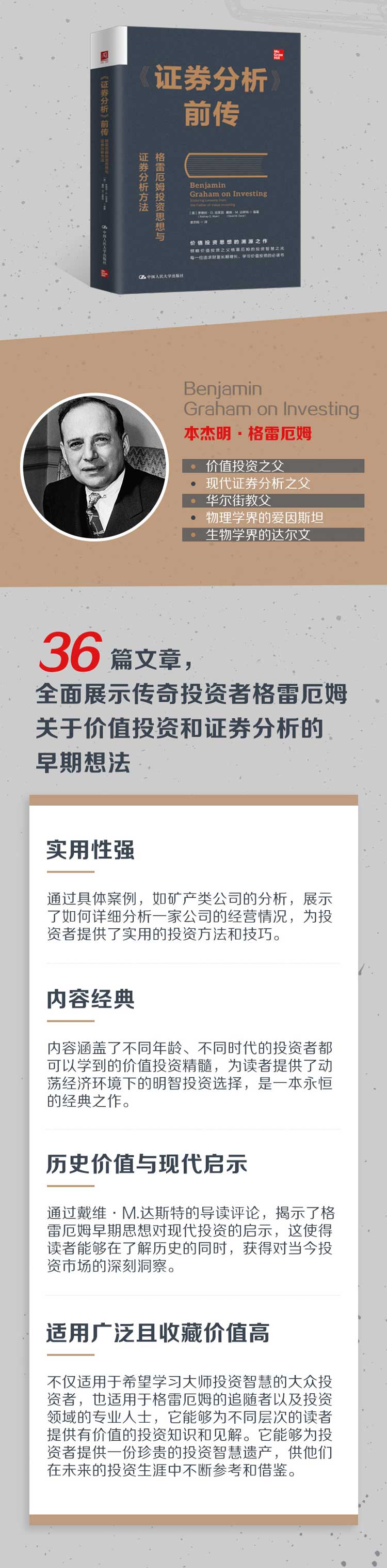 本书最鲜明的特点是史料价值与实用价值的高度统一。作为格雷厄姆早期思想的原始载体,书中文章保留了未经后期整理的原生思考,通过大量当时的市场案例和数据图表,真实还原了价值投资理念形成的历史语境,让读者能直观看到格雷厄姆如何在投机盛行的市场中构建理性分析框架。同时,本书实用性极强,格雷厄姆不依赖抽象理论,而是通过矿产、铁路、化工等不同行业的具体案例,详细演示了如何分析公司资产负债表、收益记录,如何判断企业内在价值与市场价格的背离,这些分析方法至今仍具有可操作性。此外,戴维・M. 达斯特为本书撰写的导读和评论,将百年前的投资思考与现代市场环境相结合,揭示了这些早期思想对当今投资的启示,让古老智慧焕发新的生命力。