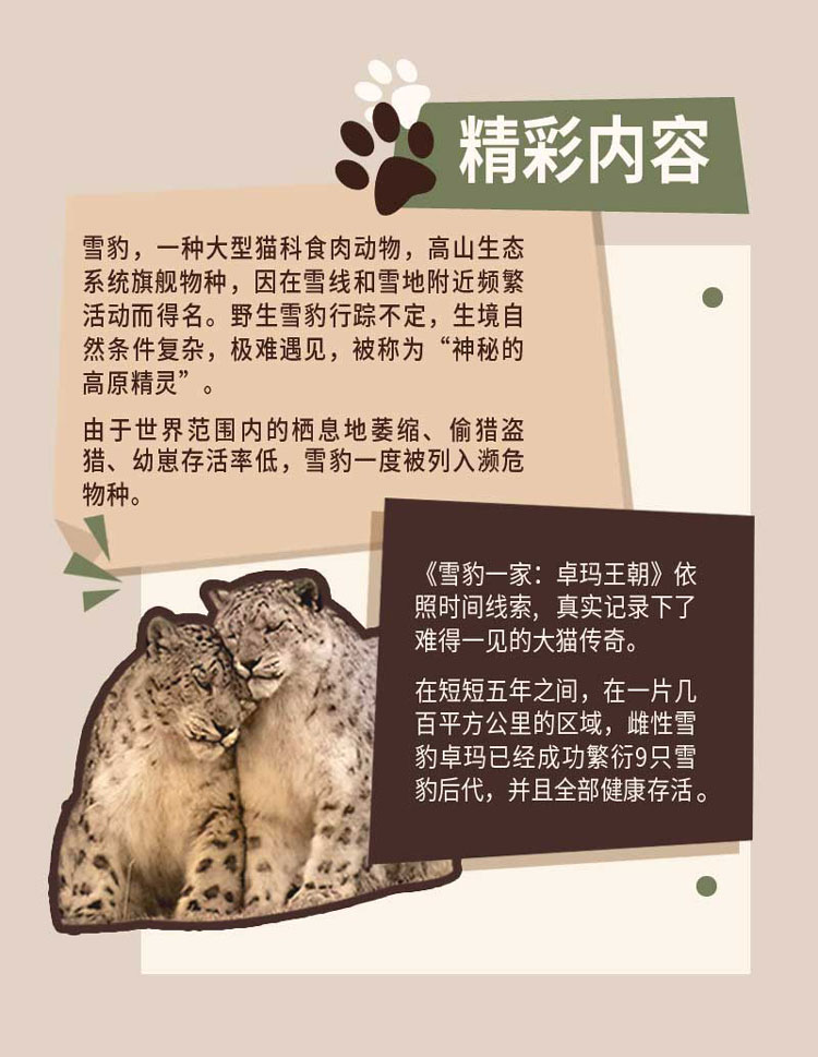 全书内容依照时间顺序展开,从作者最初遇见雪豹卓玛开始,详细记录了卓玛三次生育的过程及其子女的成长轨迹。第一胎包括女儿拉姆和两只雄性幼崽,作者记录了2020年6月至2021年6月间这一家四口的活动,包括三兄妹学习独立生存、兄妹分别以及母女重逢的过程。第二胎是独生女梅朵,生于2021年11月,作者特别记录了2022年4月至5月间观察到的罕见现象——雪豹在育幼期求偶和交配的行为,以及梅朵在母亲照料下成长的经历。第三胎是两只幼崽,此时大女儿拉姆已经长大,书中记录了2023年2月至3月间出现的独特行为:拉姆代替母亲抚养妹妹梅朵,这种姐代母职的现象在独居动物中十分少见。随后拉姆自己也产下三胞胎,成为新手母亲,作者记录了它三次迁移领地的过程,直至2023年12月探寻到幼崽诞生之地作为全书收尾。此外,书中还穿插了对雪豹表情、习性、身体构造的科普讲解,以及对狼、岩羊、兔狲等伴生物种的观察记录。