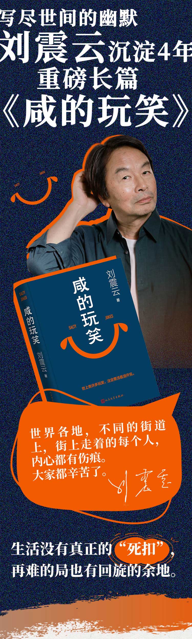 《咸的玩笑》是刘震云2026年1月出版的长篇小说,距他获得茅盾文学奖已过去十四年,距离上一部作品《一日三秋》也已四年。这本书延续了刘震云一贯的创作底色,写的是普通人在生活中的摸爬滚打,以及他们如何与命运和解的故事。书名中的"咸"字用得贴切,既指眼泪的咸味,也暗示生活中那些苦涩的玩笑——当玩笑开过了头,笑里就掺进了咸涩的滋味。